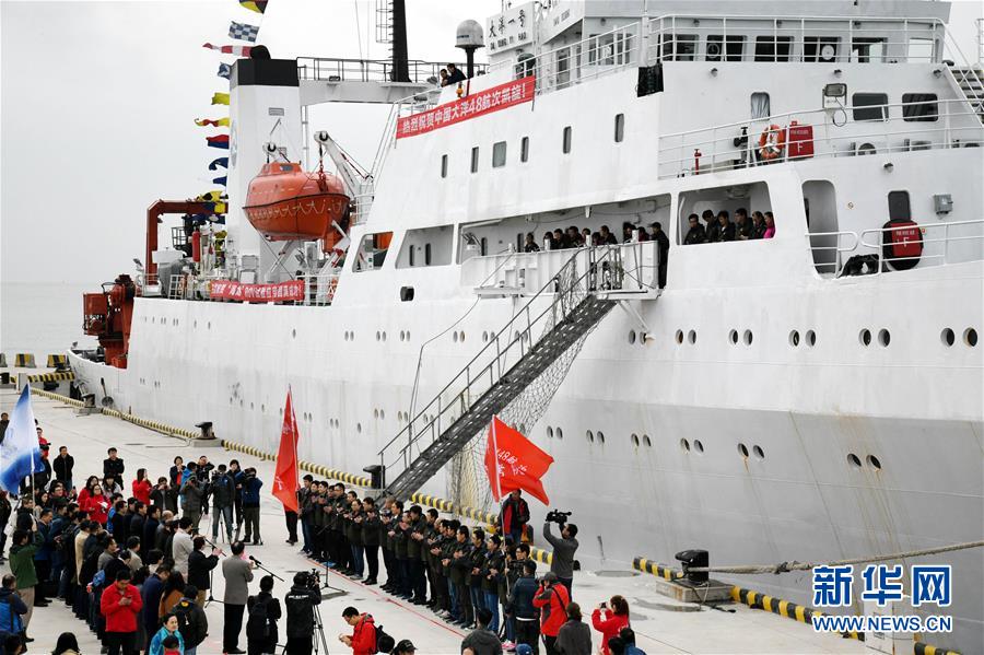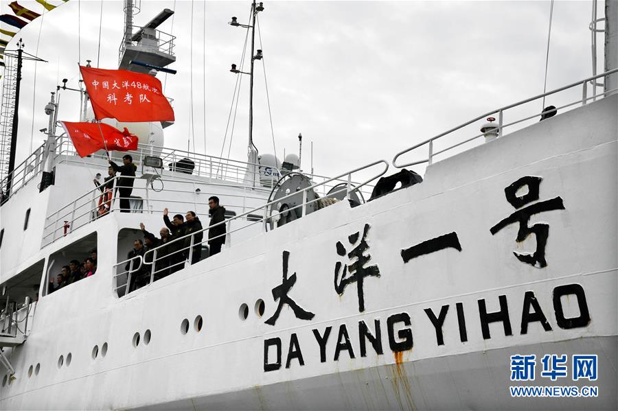 11月7日,科考隊員在“大洋一號”上向前來迎接的人群揮手致意。 新華社記者 李紫恒 攝