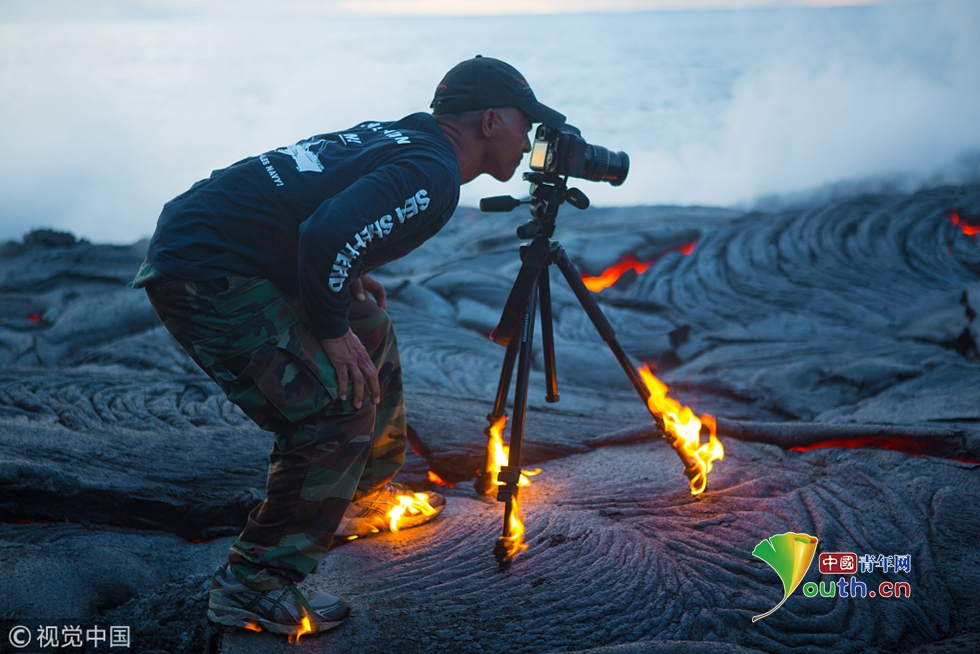 距離巖漿如此之近拍照十分危險。攝影師Kawika Singson在拍攝過程中,經(jīng)歷了極大的危險。流入海洋的巖漿量,風向,以及巖漿基床的結實程度等風險都需要考慮。 圖片來源:視覺中國
