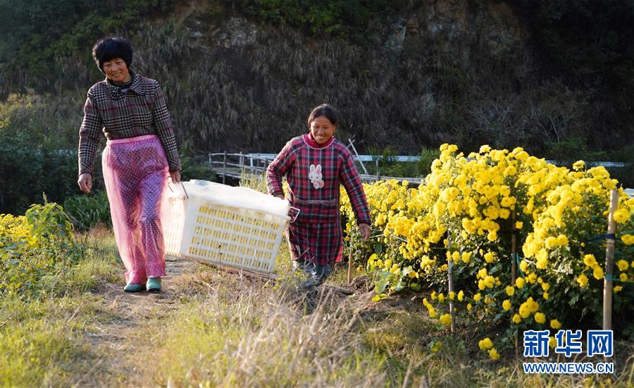 11月8日,婺源縣思口鎮(zhèn)農(nóng)戶在運送采摘的皇菊。新華社記者 胡晨歡 攝