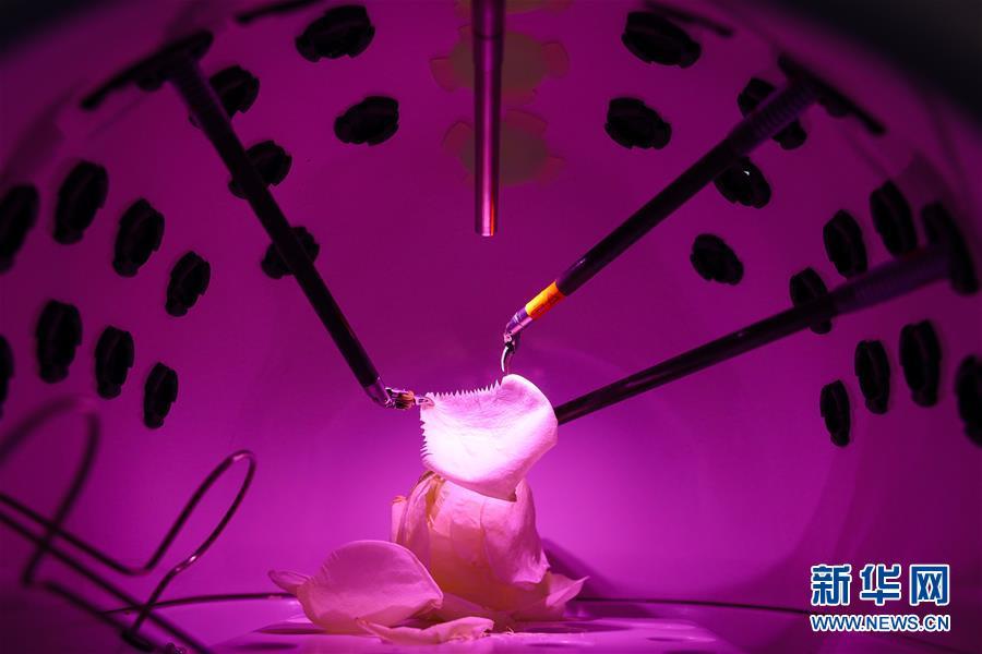 11月8日,在進(jìn)博會(huì)醫(yī)療器械及醫(yī)藥保健展區(qū),達(dá)芬奇Xi手術(shù)系統(tǒng)在演示切割花瓣。新華社記者 劉大偉 攝