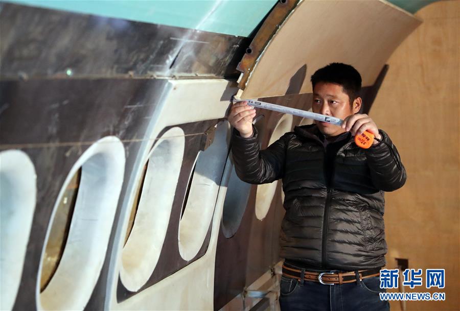 11月10日,在遼寧開原老城街道前三臺(tái)子村,朱躍在“飛機(jī)”內(nèi)部測(cè)量安裝尺寸。 新華社記者 楊青 攝