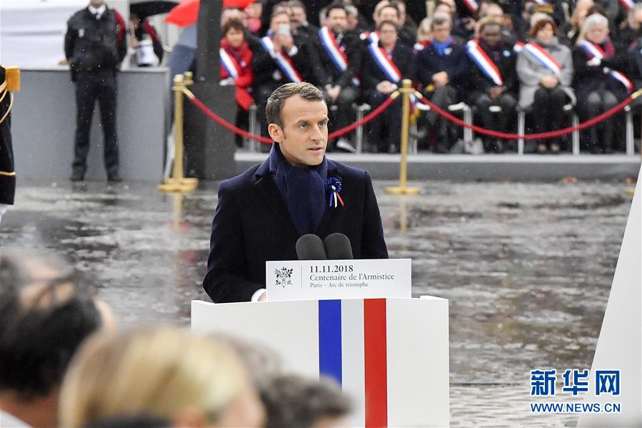 11月11日,在法國(guó)巴黎,法國(guó)總統(tǒng)馬克龍?jiān)诩o(jì)念儀式上致辭。當(dāng)日,法國(guó)政府在巴黎凱旋門(mén)前舉行儀式,隆重紀(jì)念第一次世界大戰(zhàn)結(jié)束一百周年。新華社記者 陳益宸 攝