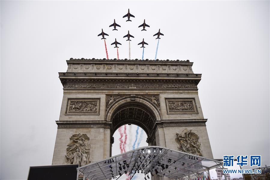 11月11日,在法國(guó)巴黎,“法蘭西巡邏兵”飛行表演隊(duì)在紀(jì)念儀式上飛過(guò)凱旋門(mén)。當(dāng)日,法國(guó)政府在巴黎凱旋門(mén)前舉行儀式,隆重紀(jì)念第一次世界大戰(zhàn)結(jié)束一百周年。新華社記者 陳益宸 攝