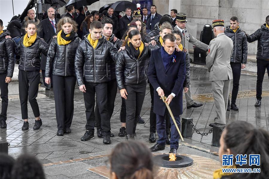 11月11日,在法國(guó)巴黎,法國(guó)總統(tǒng)馬克龍?jiān)诩o(jì)念儀式上撥旺無(wú)名烈士墓的火焰。當(dāng)日,法國(guó)政府在巴黎凱旋門(mén)前舉行儀式,隆重紀(jì)念第一次世界大戰(zhàn)結(jié)束一百周年。新華社記者 陳益宸 攝