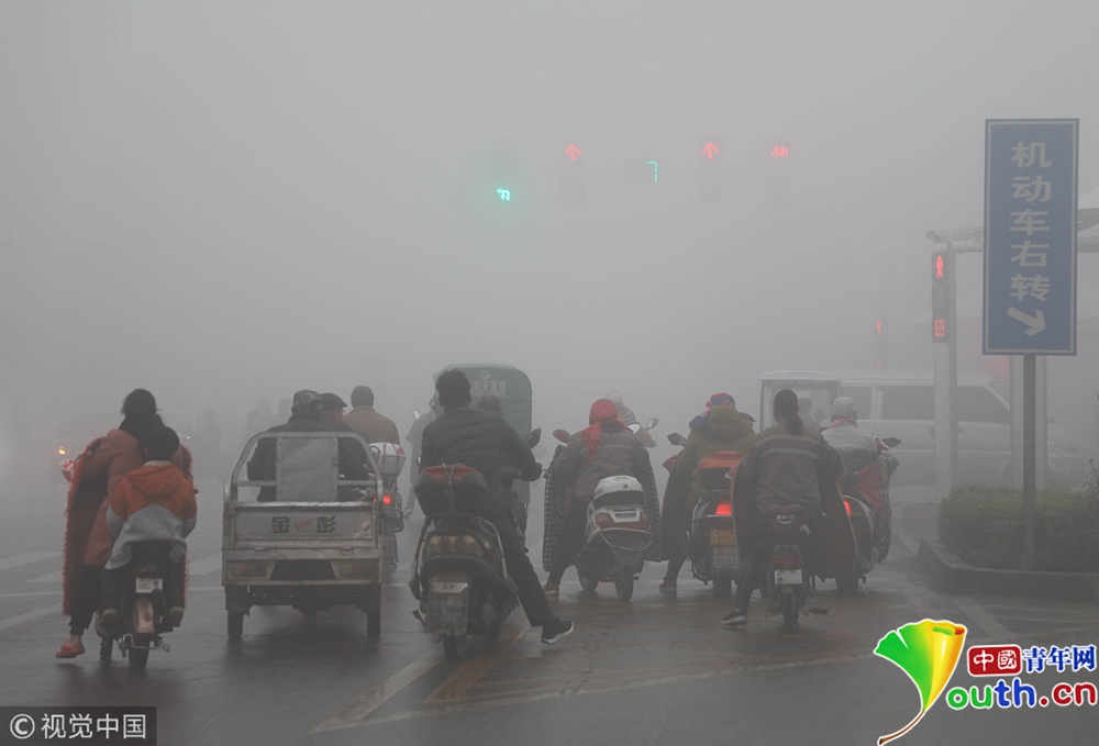 2018年11月12日,河南平頂山寶豐縣出現(xiàn)大霧, 街頭汽車打開(kāi)霧燈,行人小心行走。