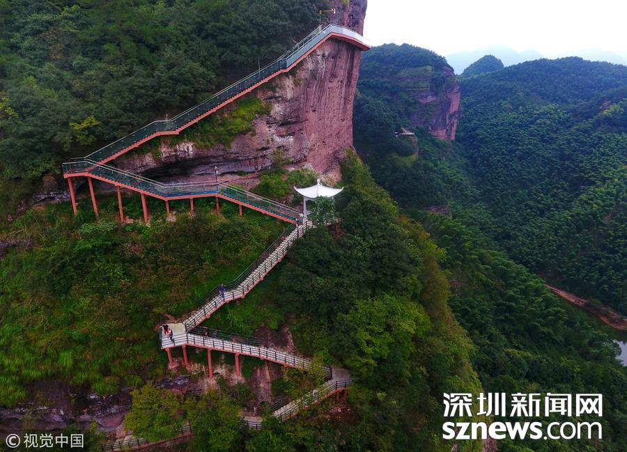 深圳新聞網(wǎng)訊 2018年6月19日,航拍江西贛州南武當(dāng)山百米高空玻璃棧道。棧道緊貼峭壁,在懸崖之上凌空蜿蜒穿行,猶如一條玉龍盤(pán)旋在綠林石海之中。 南武當(dāng)山位于江西最南端的龍南縣武當(dāng)鎮(zhèn)境內(nèi),景區(qū)核心面積達(dá)到13.5平方公里,擁有99座千姿百態(tài)的巍峨石峰,丹霞地質(zhì)風(fēng)貌突出,連綿十里,被稱(chēng)為“武當(dāng)十里畫(huà)廊”。