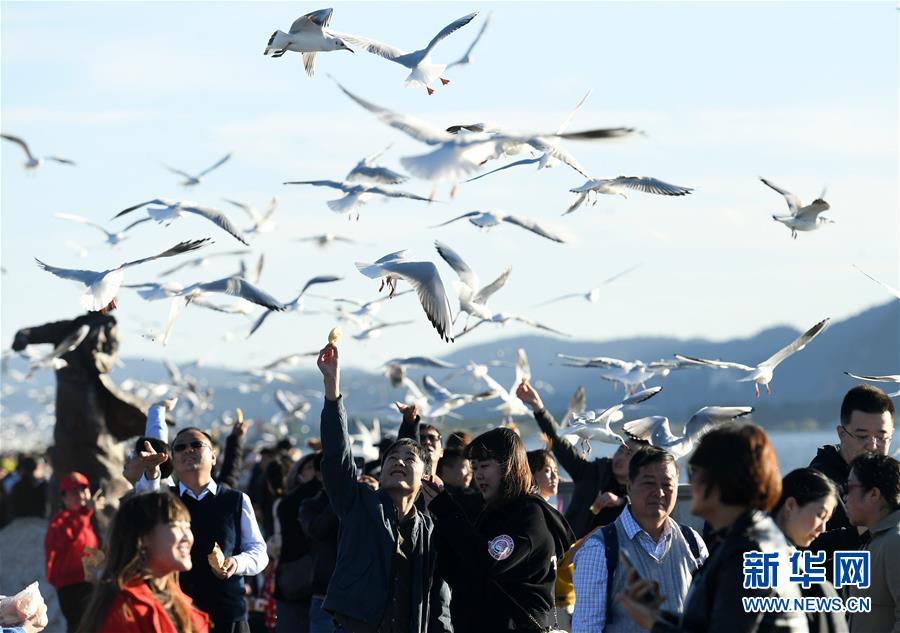 11月14日,人們在昆明滇池邊觀賞紅嘴鷗。 新華社記者 藺以光 攝