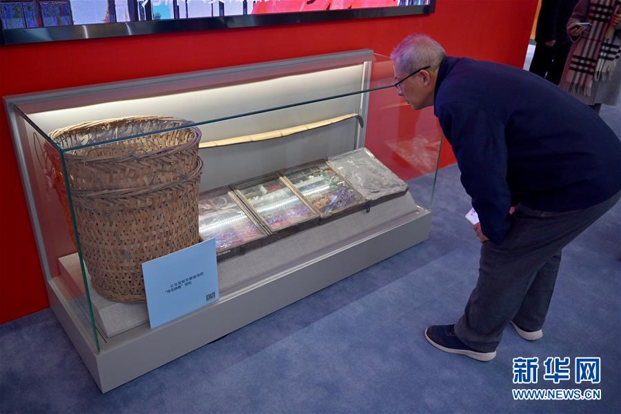 11月15日,一名參觀者在“歷史巨變”展區(qū)觀看義烏貨郎早期使用的“雞毛換糖”貨擔(dān)。