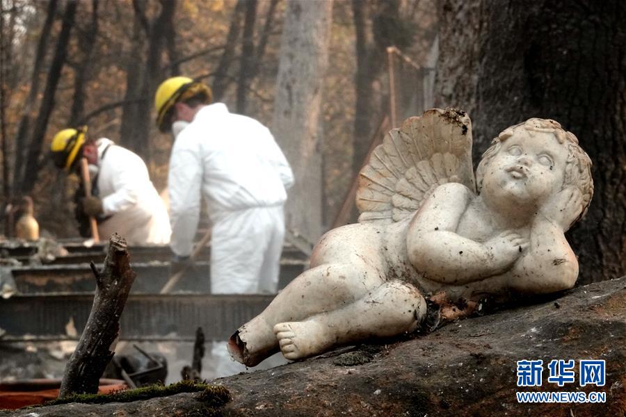 11月19日,在美國加利福尼亞州比尤特縣天堂鎮(zhèn),救援人員在山火廢墟中工作。
