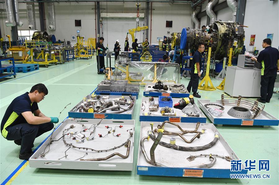 11月15日,在福建自貿(mào)區(qū)廈門片區(qū)的新科宇航科技有限公司航空維修車間內(nèi),技術(shù)人員維修飛機(jī)發(fā)動(dòng)機(jī)。 新華社記者姜克紅攝
