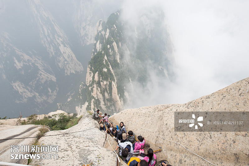2015年09月18日,陜西渭南,西岳華山歷來被認(rèn)為是五岳之中最為險峻的,而在華山中,險中之險莫過于“長空棧道”和“鷂子翻身”。華山長空棧道位于華山南峰東側(cè)山腰,是一條具有七百多年歷史的古棧道。棧道上下皆是懸崖絕壁由30多厘米寬的木板和條石搭成,下面是萬丈深淵,僅靠一條鐵索作為抓手,被喻為“華山第一天險”。