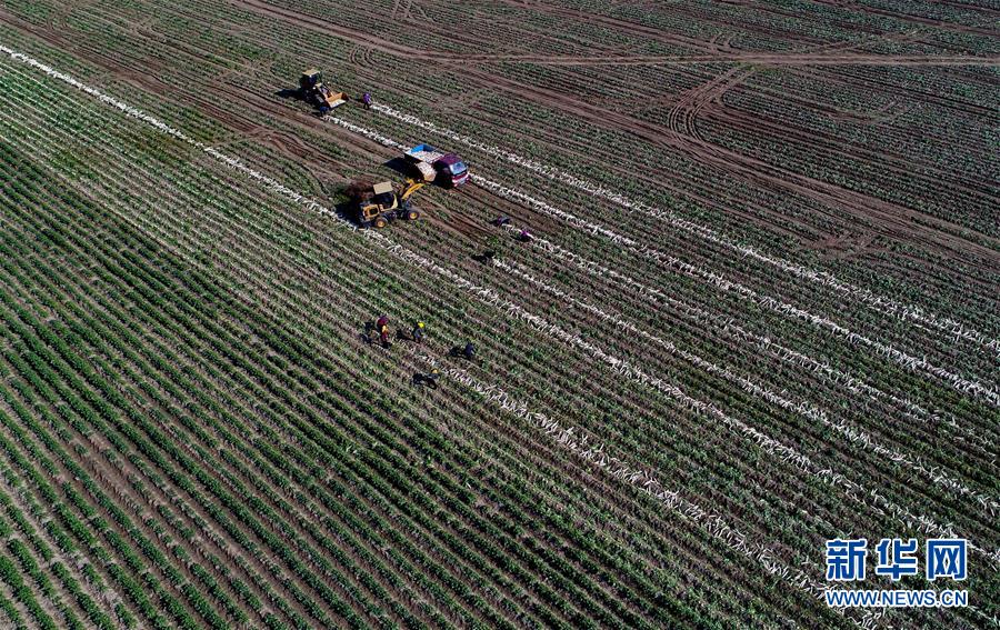 黃驊市常郭鎮(zhèn)一種植專業(yè)合作社社員在收獲白蘿卜(11月19日無人機(jī)拍攝)。 新華社記者 楊世堯 攝