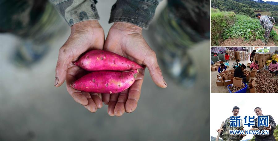 拼版照片:左圖為在大浪鎮(zhèn)桐里村,55歲的韋炳莊手捧剛剛收獲的高山紅薯;右上圖為韋炳莊在地里挖紅薯;右中圖為在縣城一個電商基地里,工作人員打包貧困戶種植的紅薯,準備發(fā)往全國各地;右下圖為韋炳莊(左)在地里挖紅薯(照片均攝于11月18日)。今年,韋炳莊種植3畝高山紅薯,每畝年產(chǎn)3000多斤,他家已于2016年實現(xiàn)脫貧。 廣西融水苗族自治縣是國家扶貧工作重點縣,全縣“九山半水半分田”,生活生產(chǎn)環(huán)境較為惡劣,脫貧攻堅任務(wù)艱巨,目前還有7.68萬貧困人口。面對經(jīng)濟發(fā)展落后、貧困面廣且程度深的現(xiàn)狀,當(dāng)?shù)匕衙撠毠耘c創(chuàng)新產(chǎn)業(yè)扶持相結(jié)合,依托生態(tài)資源優(yōu)勢,實施“特色產(chǎn)業(yè)富民行動”,通過發(fā)展特色民族旅游、林下經(jīng)濟和特色養(yǎng)殖業(yè)等扶貧產(chǎn)業(yè),帶動貧困群眾依靠勤勞的雙手,拔窮根摘窮帽,實現(xiàn)脫貧致富。據(jù)了解,目前全縣貧困戶參與特色產(chǎn)業(yè)發(fā)展的有2.9萬戶,扶貧產(chǎn)業(yè)覆蓋率達95%。 新華社記者 黃孝邦 攝