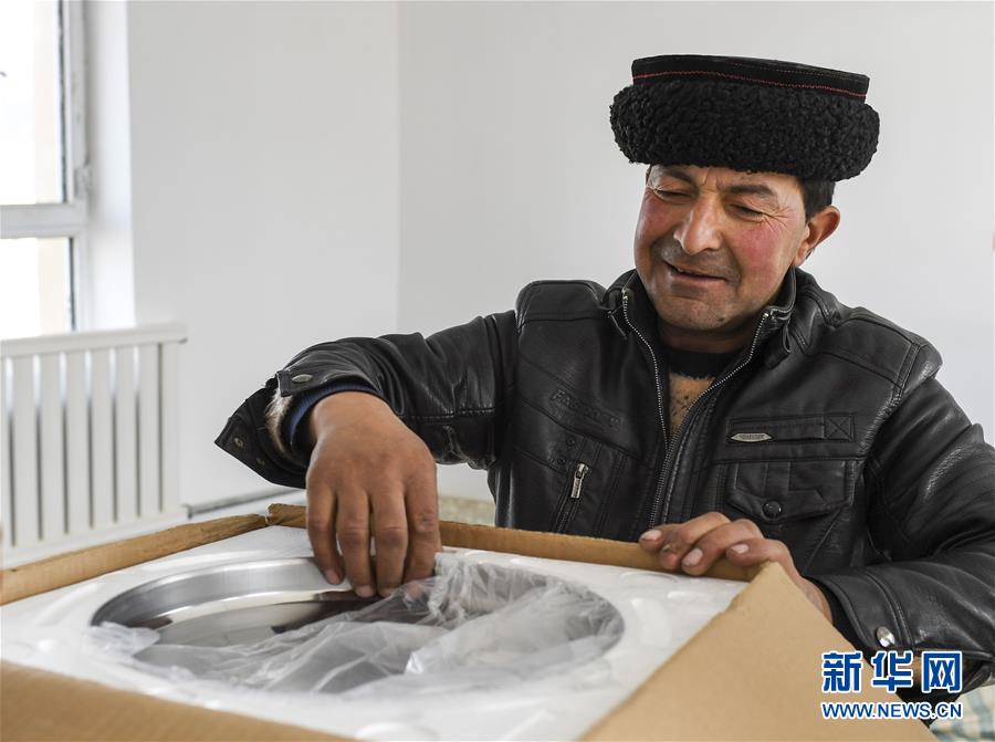 在塔什庫爾干塔吉克自治縣塔提庫力易地扶貧搬遷安置點(diǎn)的新房內(nèi),都熱·加爾曼領(lǐng)取免費(fèi)發(fā)放的電飯鍋(11月18日攝)。新華社記者胡虎虎攝
