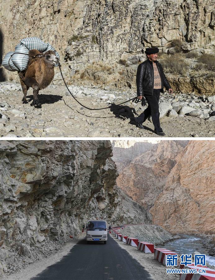 拼版照片:上圖為都熱·加爾曼牽著馱有行李的駱駝走在通往阿克托尕欄桿村村委會的路上;下圖為都熱·加爾曼乘坐汽車從大同鄉(xiāng)前往塔提庫力易地扶貧搬遷安置點(diǎn)(11月17日攝)。新華社記者胡虎虎攝