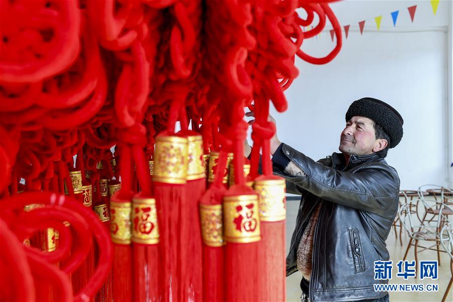 在塔什庫爾干塔吉克自治縣塔提庫力易地扶貧搬遷安置點(diǎn)的衛(wèi)星工廠,都熱·加爾曼在參觀由村民編制的手工藝品(11月18日攝)。新華社記者胡虎虎攝