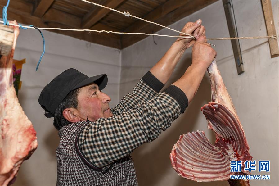 出發(fā)的前一天,都熱·加爾曼把分割好的羊肉掛在家中,這是他特意為暫時留守在家中的妻子和老人準(zhǔn)備的(11月16日攝)。新華社記者胡虎虎攝