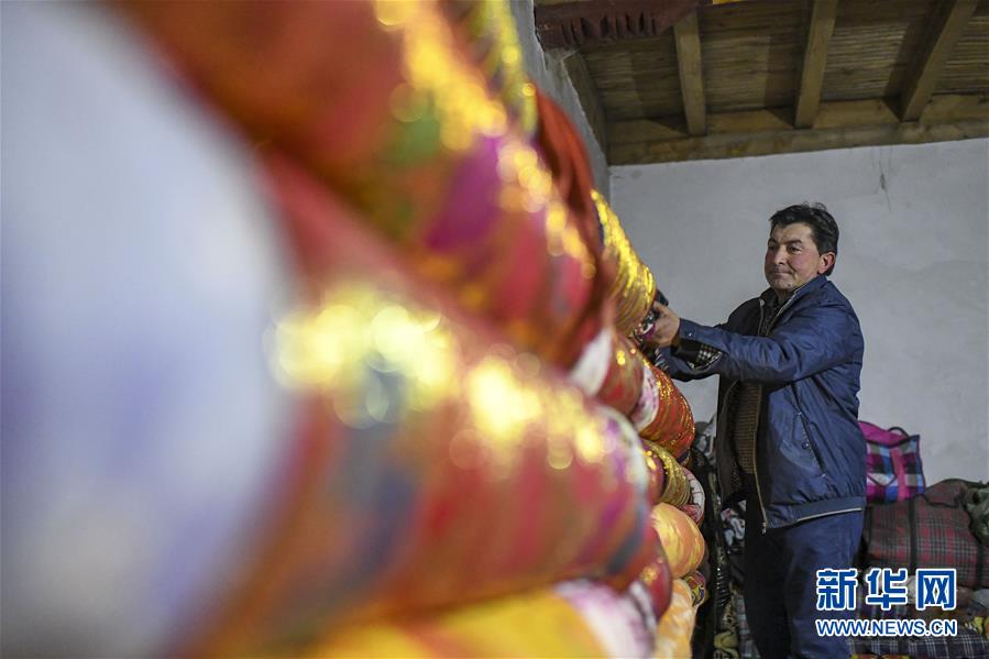 在塔什庫爾干塔吉克自治縣大同鄉(xiāng)阿克托尕欄桿村一組都熱的舊居中,都熱·加爾曼的妻子在縫制新被子,為搬遷新居做準(zhǔn)備(11月13日攝)。新華社記者胡虎虎攝