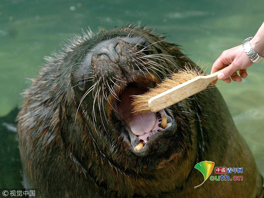 2006年5月18日,英國(guó)城市達(dá)德利,一只十四歲的海獅奧利爾在動(dòng)物園里接受飼養(yǎng)員的護(hù)理。奧利爾體重達(dá)四百千克,每次進(jìn)餐后飼養(yǎng)員要給奧利爾刷牙,每月進(jìn)行一次牙科衛(wèi)生檢查。