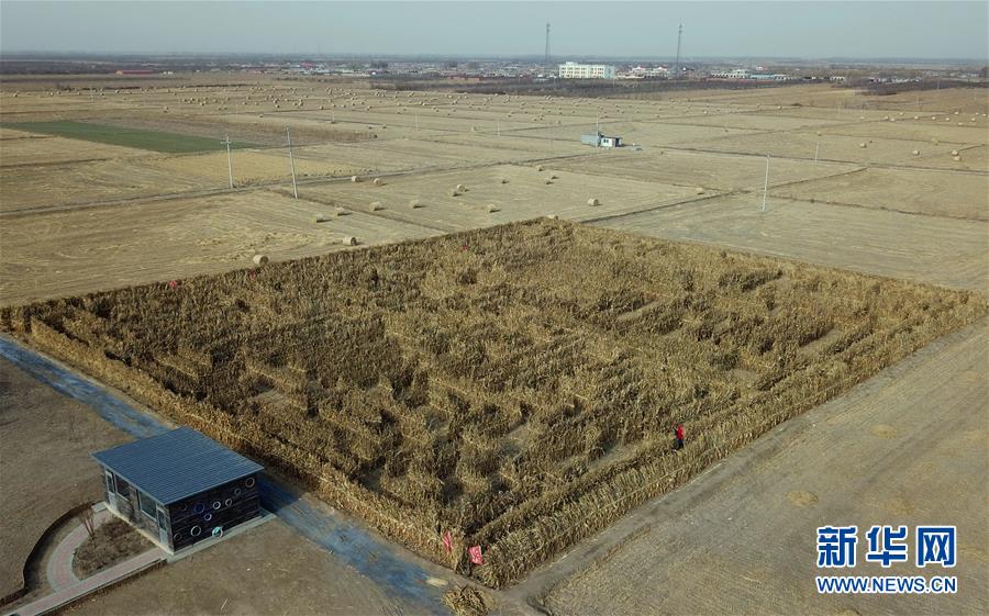 11月28日,游客在昌黎縣劉臺莊鎮(zhèn)白棗林村的玉米秸稈迷宮內(nèi)游玩(無人機拍攝)。 新華社記者楊世堯攝