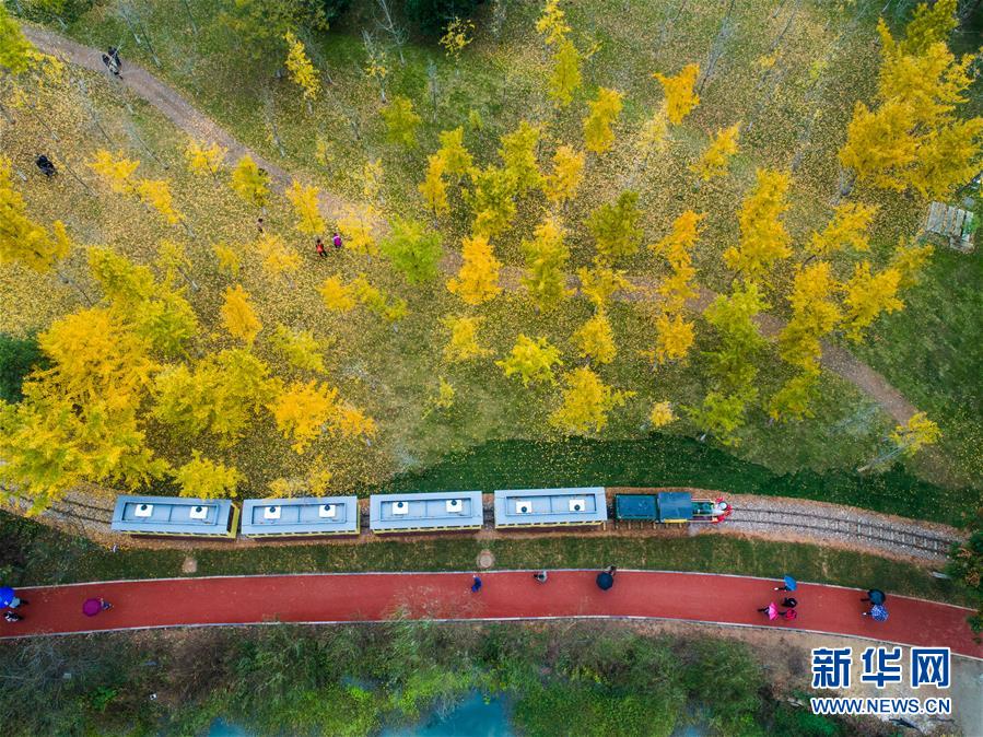 一列觀光小火車帶著游客穿行在銀杏林里(11月16日無人機拍攝)。近日,在浙江省長興縣小浦鎮(zhèn),“十里銀杏長廊”和近千畝花海經(jīng)過近一年的升級改造后,以嶄新的面貌與游客見面?;ê?、觀光小火車、古村民宿、銀杏長廊等旅游項目全面提升了小浦鎮(zhèn)鄉(xiāng)村旅游的品質(zhì)。新華社記者 徐昱 攝