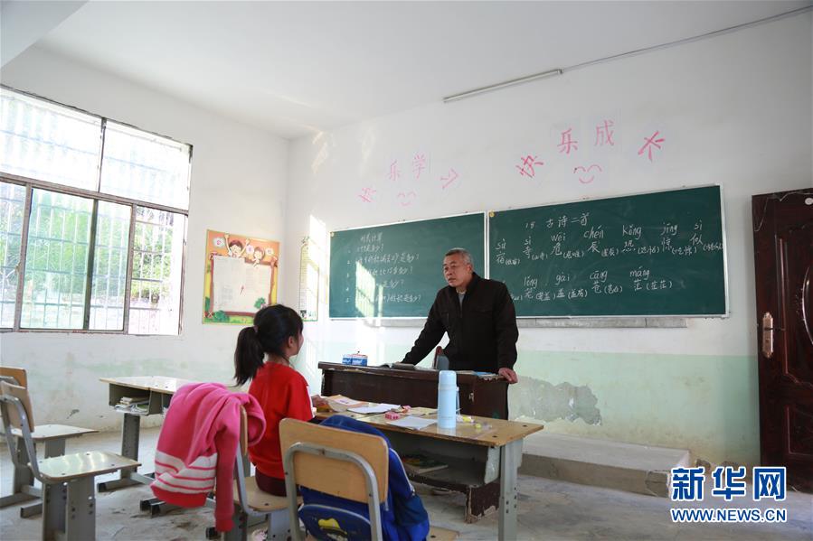 11月29日,在湖南省永州市冷水灘區(qū)黃陽司鎮(zhèn)天里坪村小學(xué)教學(xué)點(diǎn),55歲的唐炳元在給7歲的陳宏薈上課,該教學(xué)點(diǎn)只有一名老師一名學(xué)生。 55歲的唐炳元已是滿頭白發(fā),他身后的墻壁上有兩塊黑板,一塊寫著數(shù)學(xué)題,一塊寫著漢字和拼音??帐幍慕淌覂?nèi),只擺有4張課桌。在今年上半年,班上還有4名學(xué)生,到下半年就只剩下1名了。