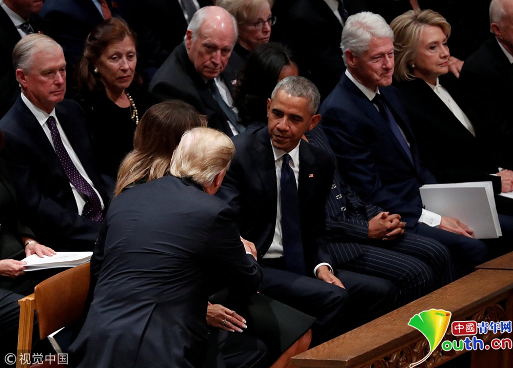 當(dāng)?shù)貢r(shí)間2018年12月5日,美國(guó)華盛頓,美國(guó)國(guó)家大教堂舉行第41任總統(tǒng)老布什葬禮,美國(guó)現(xiàn)任和前任總統(tǒng)出席儀式,特朗普全程和克林頓夫婦無(wú)交流,僅與奧巴馬握了手。據(jù)美媒揭露,特朗普自2017年1月上任以來(lái),從未與奧巴馬或克林頓夫婦交談。
