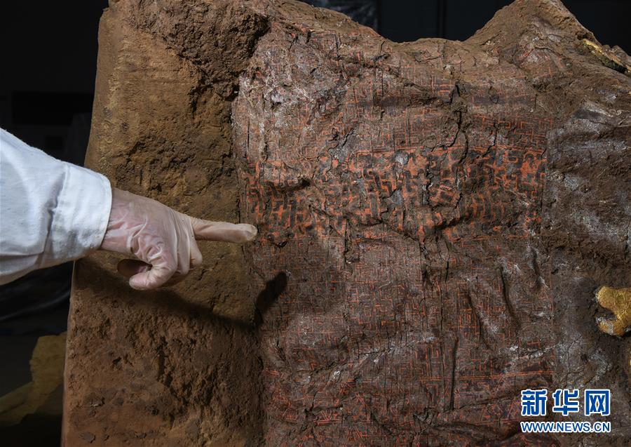 這是在位于河北行唐的考古實驗室內拍攝的裝飾有繁復髤漆彩繪圖案的車廂遺存(12月4日攝)。新華社記者 李賀 攝