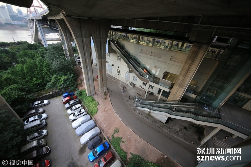 2018年5月29日,重慶,魔幻重慶又雙叒叕放大招!還有一個獨特的亮點,重慶軌道交通3號線銅元局站,出口由一段長梯銜接上方立交橋和下方的路面,與全國最高城市立交橋蘇家壩立交組成了獨特風(fēng)景,許多游客專門趕來拍照。
