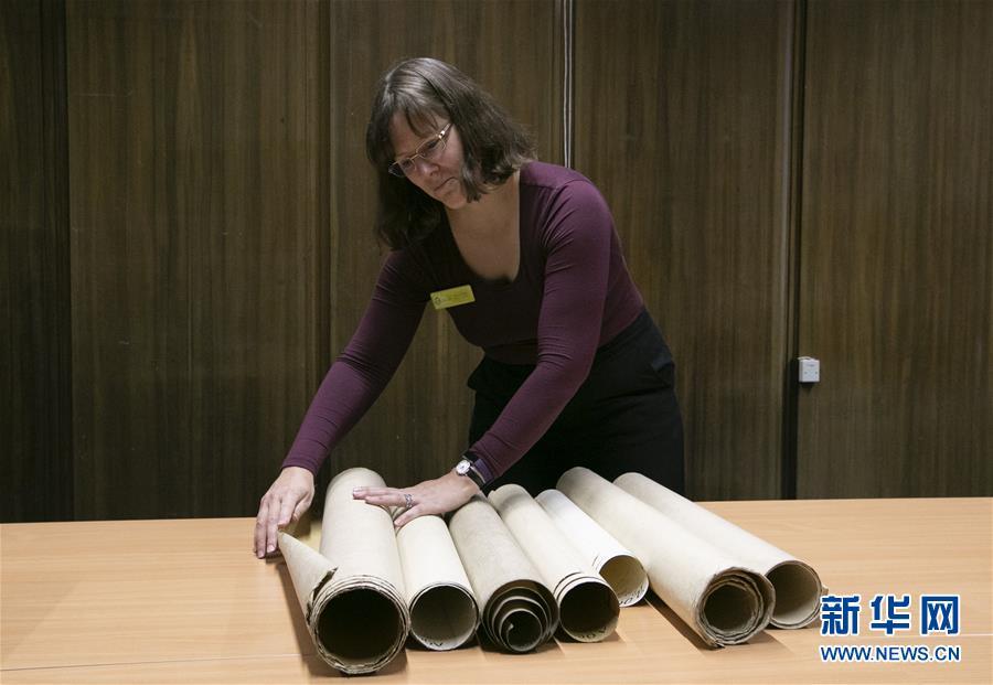 11月2日,在英國紐卡斯?fàn)柕奶┒鳌枡n案館,檔案管理員瑞秋·吉爾介紹致遠(yuǎn)艦設(shè)計(jì)圖紙。 新華社記者日前在紐卡斯?fàn)柼┒鳌枡n案館查找北洋海軍史料時發(fā)現(xiàn)一套七張、檔案名為“中國巡洋艦舵機(jī)設(shè)計(jì)圖”的原始圖紙。塵封百年,甲午海戰(zhàn)中抗擊日艦后沉沒的清北洋海軍致遠(yuǎn)艦部分原廠設(shè)計(jì)圖紙?jiān)谄浣ㄔ斓亍~卡斯?fàn)柺械囊患覚n案館首次被發(fā)現(xiàn),為打撈那段悲壯的歷史提供了重要參考。 新華社記者 韓巖 攝