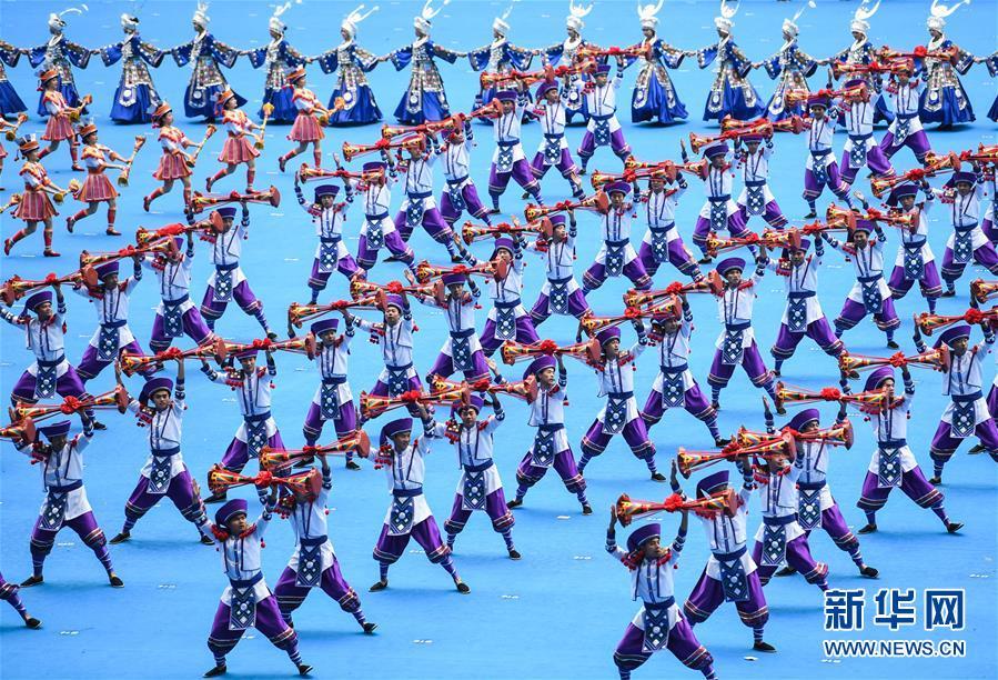12月10日,廣西壯族自治區(qū)成立60周年慶祝大會在廣西體育中心隆重舉行。這是慶祝大會上的群眾文藝表演。 新華社記者 申宏 攝