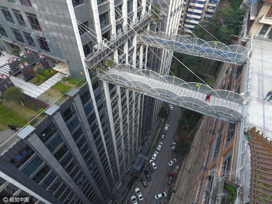 2017年3月16日,重慶,渝中區(qū)一棟大樓從22層架起兩座平行的天橋,連接對(duì)面的魁星樓廣場(chǎng)地面。圖片來(lái)源:視覺中國(guó)