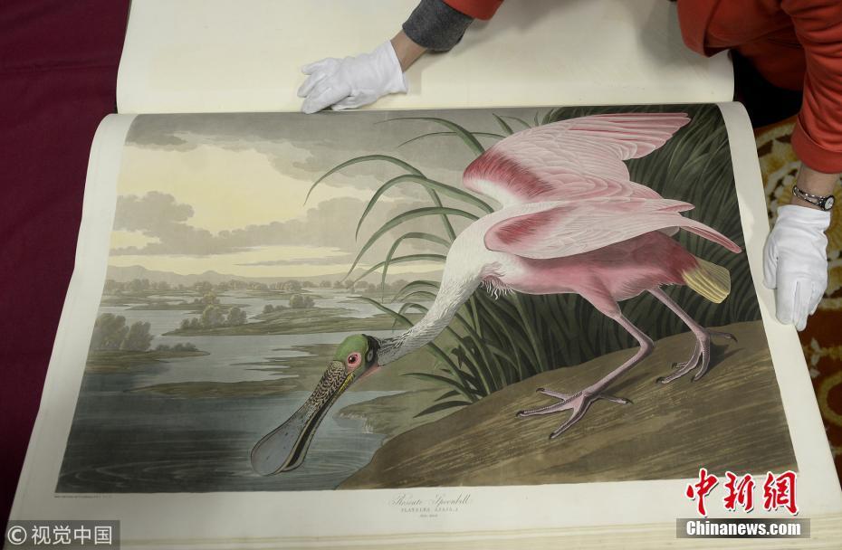 2018年12月12日消息,英國格拉斯哥,世界上最貴的印刷書——美國鳥類學家、畫家和博物學家詹姆斯·奧杜邦手繪的第一版《美國鳥類》被罕見取出米切爾圖書館保險庫公開亮相。圖片來源:視覺中國