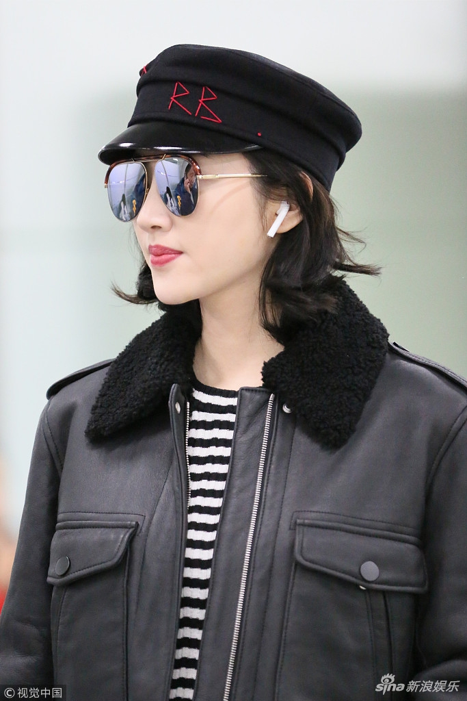 日前,景甜現(xiàn)身機場,身穿黑色皮夾克超有范兒,戴小帽酷似甜美女軍官。視覺中國/圖