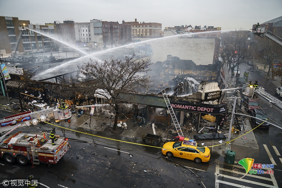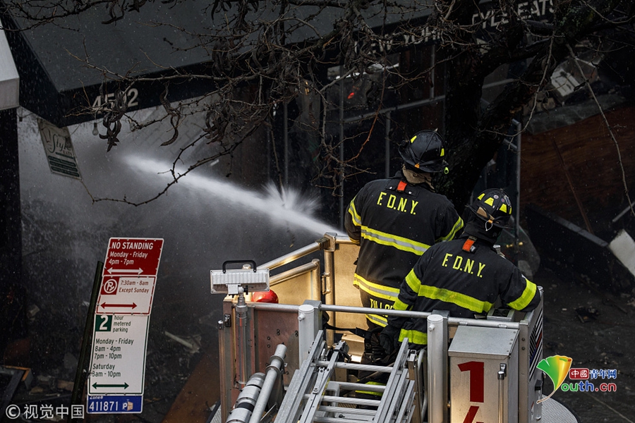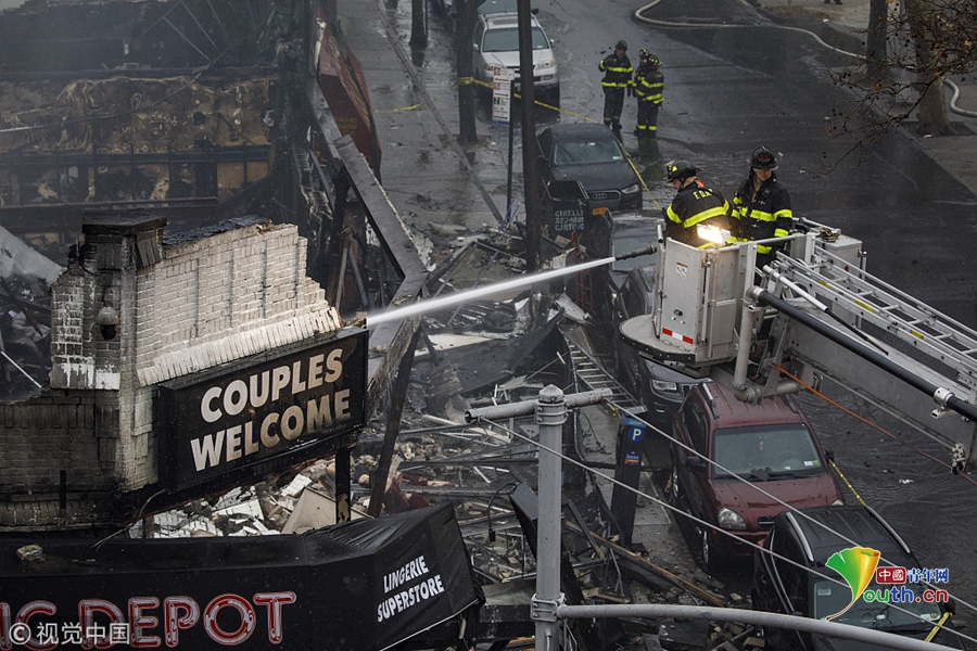 當?shù)貢r間2018年12月13日,美國紐約,在紐約皇后區(qū)皇后大道,一場大火吞噬了六家商鋪,消防隊員正在努力撲滅火災(zāi)余燼。十幾人受傷,包括6名消防員。起火原因仍在調(diào)查中。圖片作者:Drew Angerer