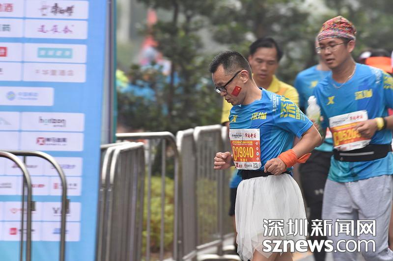 2018年12月16日,深圳國際馬拉松位于后海的折返點,一名著女式短裙的選手正在向終點沖刺。