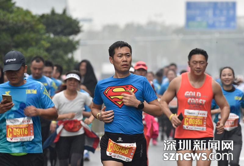 2018年12月16日,深圳國際馬拉松位于后海的折返點(diǎn),一名身著超人標(biāo)志短袖選手正在向終點(diǎn)沖刺。
