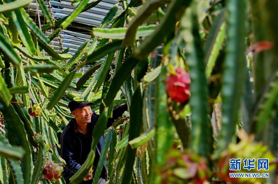 12月15日,唐山市曹妃甸區(qū)一家生態(tài)園的工人在大棚內(nèi)采摘火龍果。