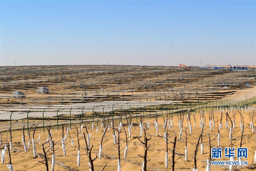 位于庫布其沙漠腹地的達拉特光伏發(fā)電應(yīng)用領(lǐng)跑基地一期500兆瓦項目(12月13日攝)。