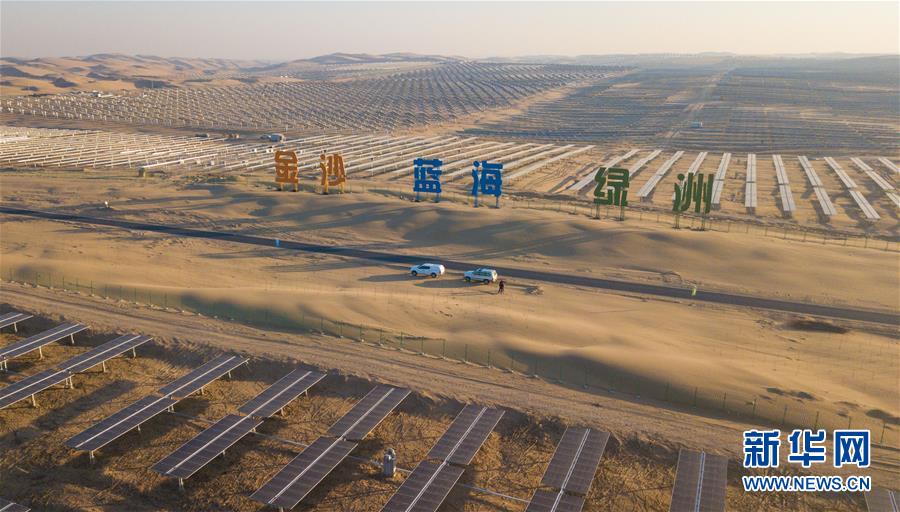 位于庫布其沙漠腹地的達拉特光伏發(fā)電應(yīng)用領(lǐng)跑基地一期500兆瓦項目(12月13日無人機拍攝)。 新華社記者 彭源攝