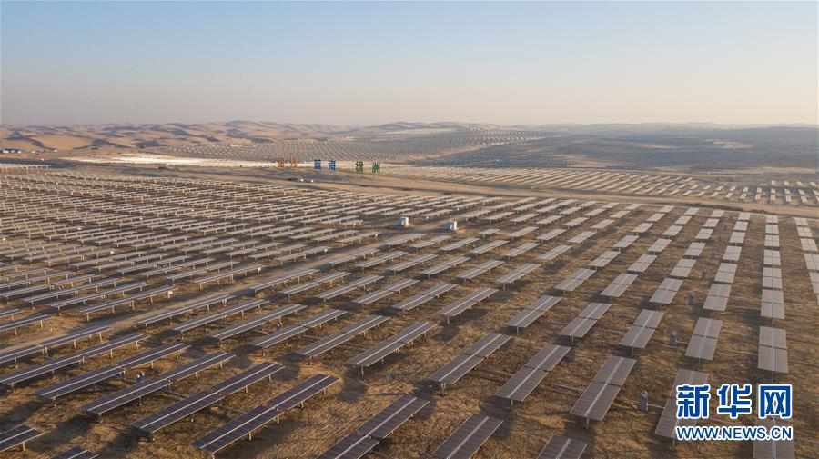 位于庫布其沙漠腹地的達拉特光伏發(fā)電應用領跑基地一期500兆瓦項目(12月13日無人機拍攝)。 新華社記者 彭源攝