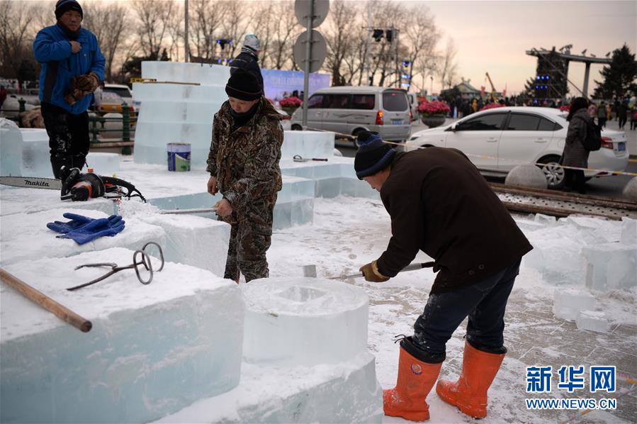 12月17日,冰雕師在松花江畔制作冰雕景觀。