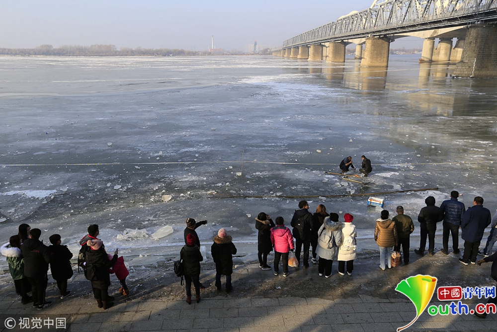 哈爾濱松花江封江 市民鑿冰捕魚(yú)