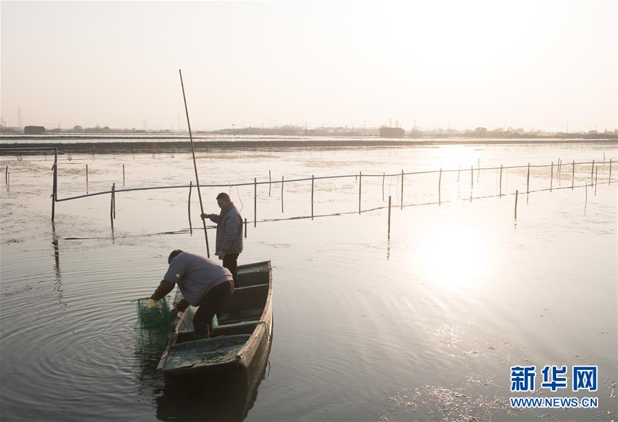 12月17日,在湖州市吳興區(qū)高新區(qū)廟港人千畝水產(chǎn)園,蟹農(nóng)在捕收大閘蟹。 新華社記者翁忻旸攝
