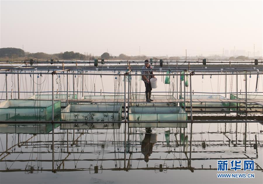 12月17日,在湖州市吳興區(qū)高新區(qū)廟港人千畝水產(chǎn)園,水產(chǎn)園負(fù)責(zé)人展示內(nèi)塘養(yǎng)殖的大閘蟹。 新華社記者翁忻旸攝