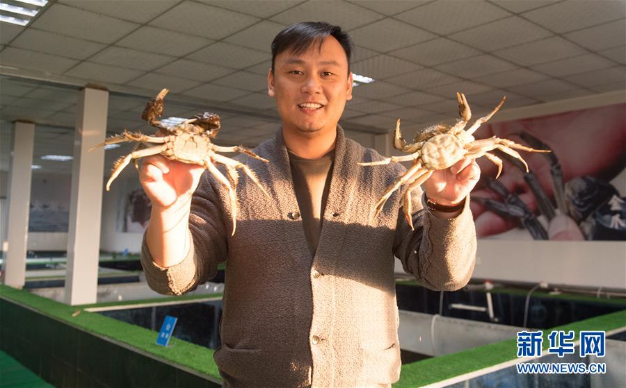 12月17日,在湖州市吳興區(qū)高新區(qū)廟港人千畝水產(chǎn)園,水產(chǎn)園負責(zé)人展示內(nèi)塘養(yǎng)殖的大閘蟹。 新華社記者翁忻旸攝