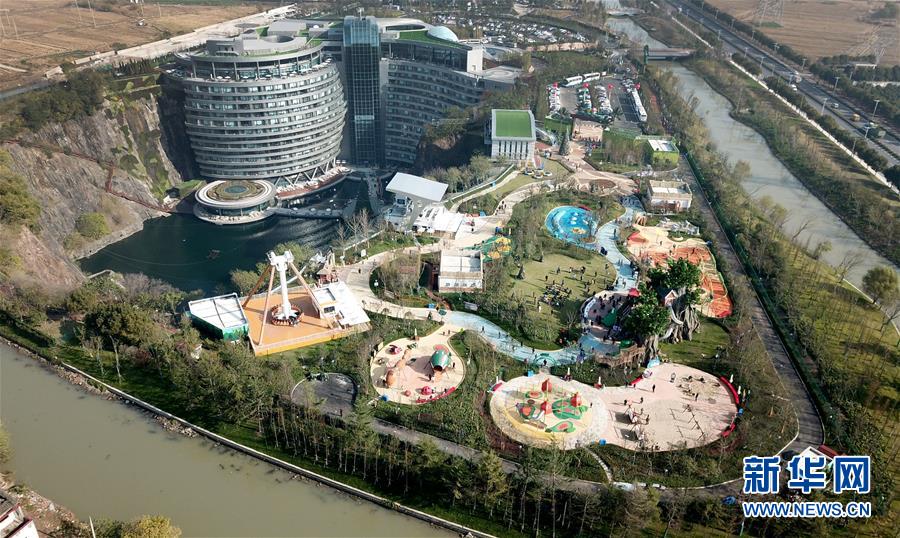 12月18日無人機(jī)拍攝的世茂精靈之城主題樂園。 當(dāng)日,“世茂精靈之城主題樂園奇幻親子嘉年華開幕暨上海公益基地揭牌儀式”在位于上海佘山國(guó)家旅游度假區(qū)的世茂精靈之城主題樂園一期(“深坑秘境”)正式啟動(dòng)?!吧羁用鼐场迸徤虾Y苌绞烂揠H酒店,除了擁有俯瞰“深坑”的玻璃棧道外,還包括360度崖壁大擺錘、精靈樹屋、沙漠考古、夢(mèng)幻水域和蟲蟲世界等項(xiàng)目,帶來親子游玩新體驗(yàn)。 新華社記者 方喆 攝