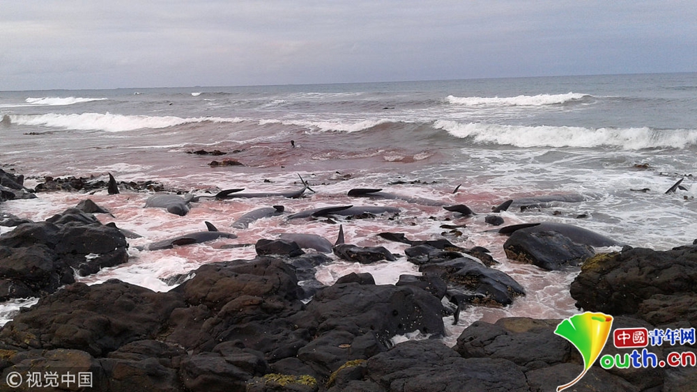 多頭巨鯨新西蘭海岸擱淺死亡 沿海海水染成紅色