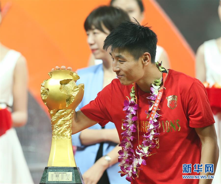 圖為2018年11月7日,上海上港隊球員武磊在球隊提前一輪奪得2018年中超聯(lián)賽冠軍后撫摸火神杯的資料照片。 新華社記者丁汀攝