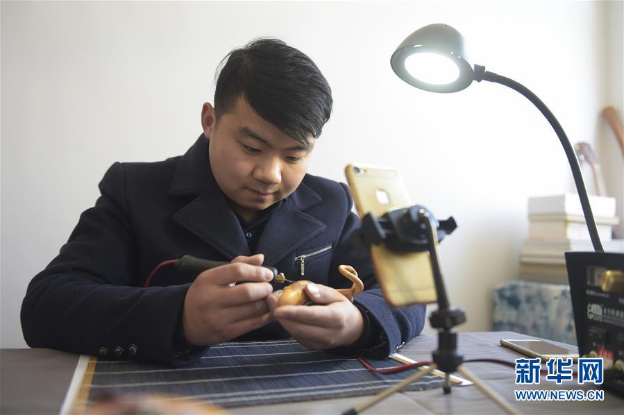 12月18日,劉征在自己的加工坊里通過手機直播展示葫蘆創(chuàng)作技藝。 新華社記者 魯鵬 攝